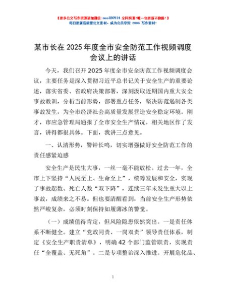 / 某市长在2025年度全市安全防范工作视频调度会议上的讲话