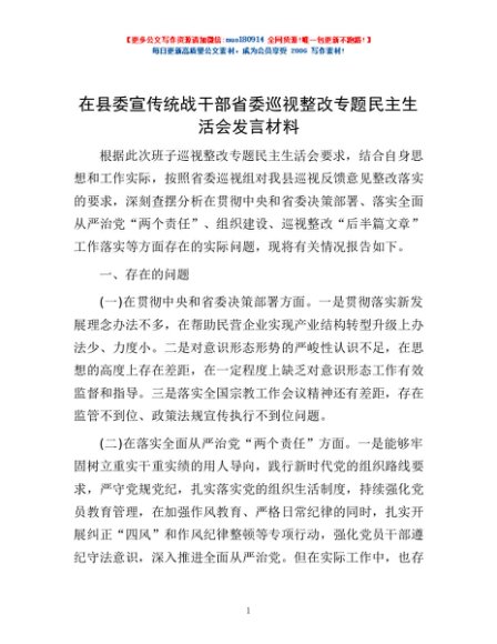 / 在县委宣传统战干部省委巡视整改专题民主生活会发言材料