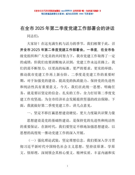 / 在全市2025年第二季度党建工作部署会的讲话