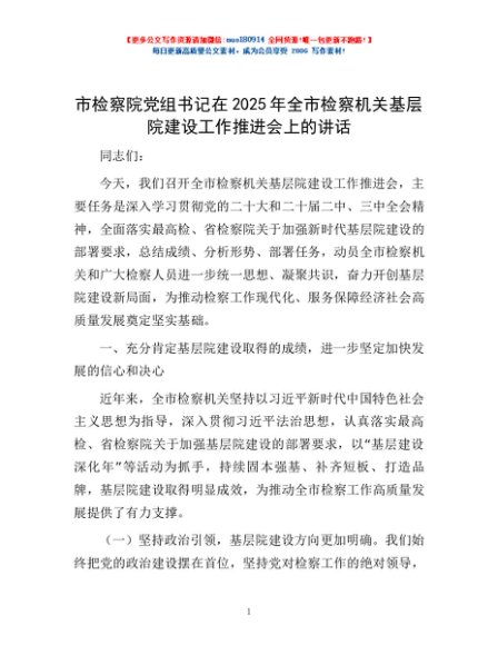 / 市检察院党组书记在2025年全市检察机关基层院建设工作推进会上的讲话