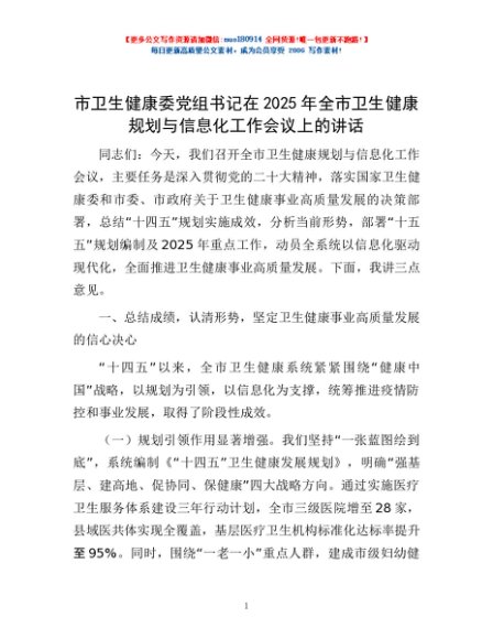 / 市卫生健康委党组书记在2025年全市卫生健康规划与信息化工作会议上的讲话