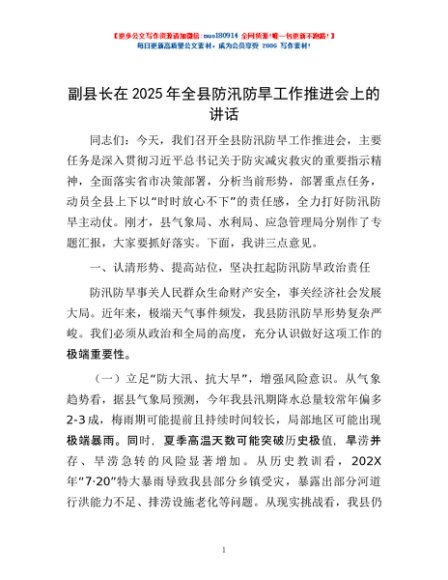 / 副县长在2025年全县防汛防旱工作推进会上的讲话