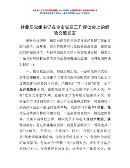 / 林业局党组书记在全市党建工作座谈会上的经验交流发言