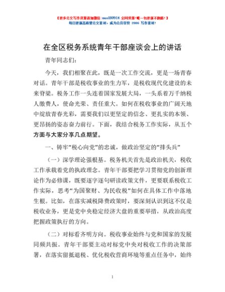 / 在全区税务系统青年干部座谈会上的讲话