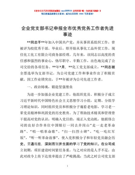/ 企业党支部书记申报全市优秀党务工作者先进事迹