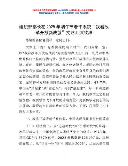 / 组织部部长在2025年端午节老干系统“我看改革开放新成就”文艺汇演致辞