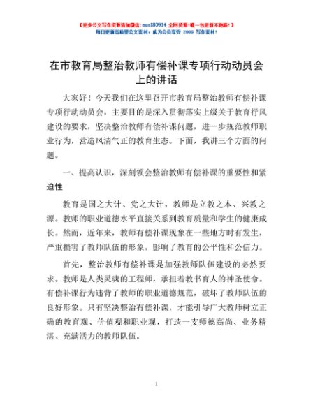 / 在市教育局整治教师有偿补课专项行动动员会上的讲话