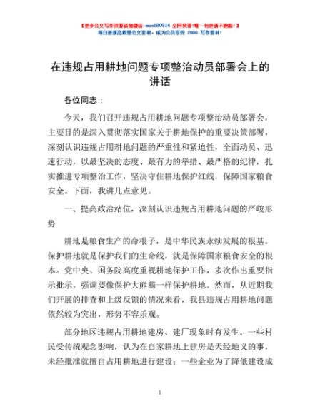 / 在违规占用耕地问题专项整治动员部署会上的讲话