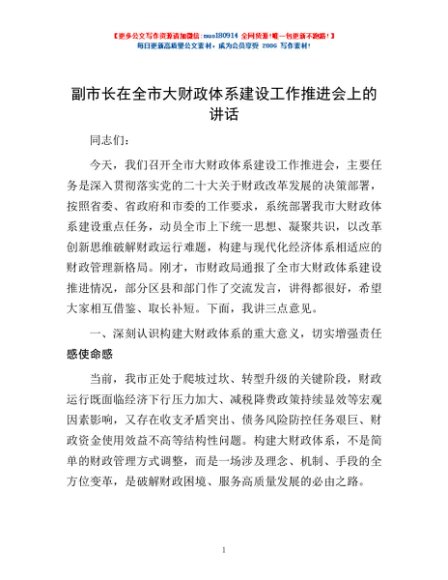 / 副市长在全市大财政体系建设工作推进会上的讲话