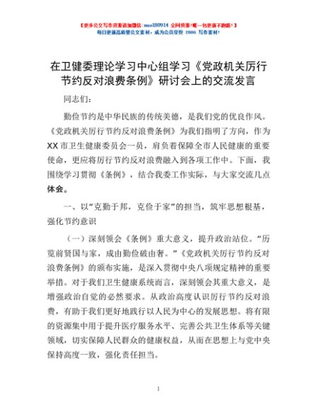 / 在卫健委理论学习中心组学习《党政机关厉行节约反对浪费条例》研讨会上的交流发言
