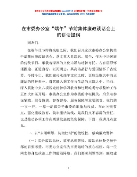 / 在市委办公室“端午”节前集体廉政谈话会上的讲话提纲