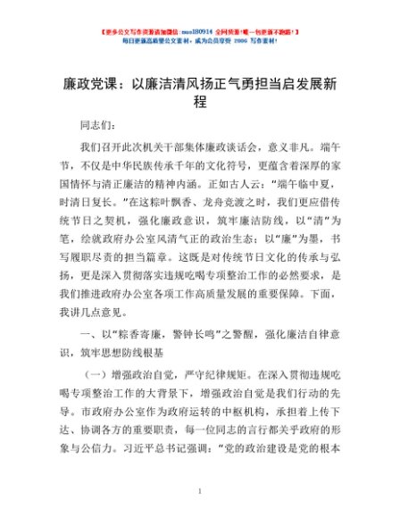 廉政党课:以廉洁清风扬正气 勇担当启发展新程