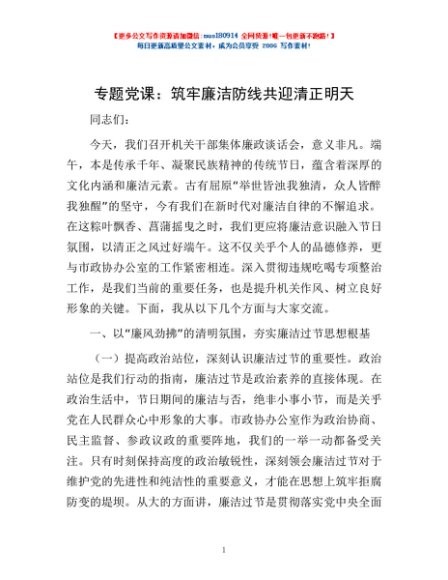 / 专题党课:筑牢廉洁防线 共迎清正明天