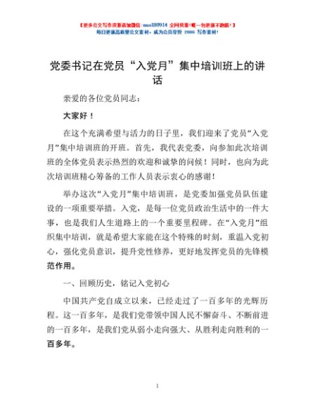 / 党委书记在党员“入党月”集中培训班上的讲话