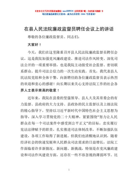 / 在县人民法院廉政监督员聘任会议上的讲话