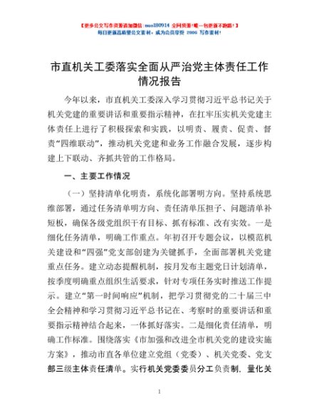 / 市直机关工委落实全面从严治党主体责任工作情况报告