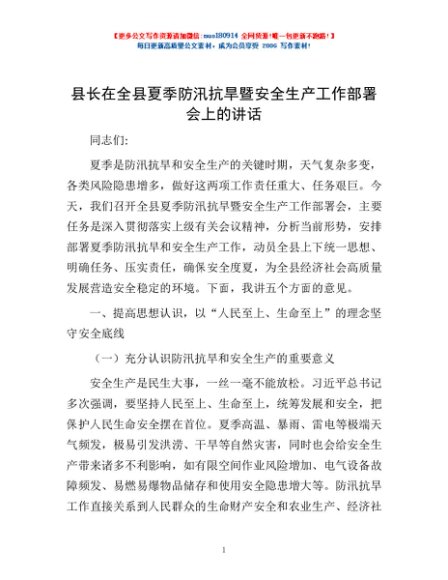 / 县长在全县夏季防汛抗旱暨安全生产工作部署会上的讲话