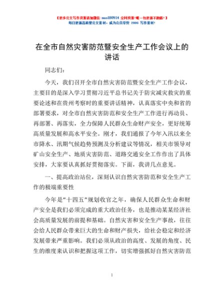 / 在全市自然灾害防范暨安全生产工作会议上的讲话