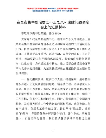 / 在全市集中整治群众不正之风和腐败问题调度会上的汇报材料