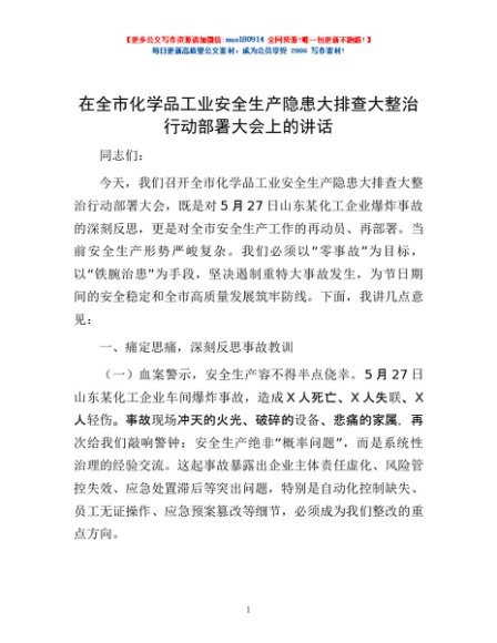 / 在全市化学品工业安全生产隐患大排查大整治行动部署大会上的讲话