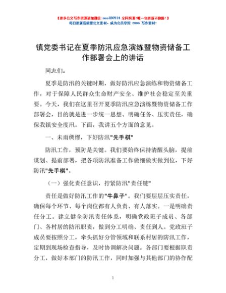 / 镇党委书记在夏季防汛应急演练暨物资储备工作部署会上的讲话