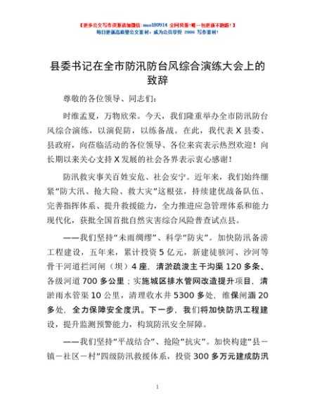 / 县委书记在全市防汛防台风综合演练大会上的致辞