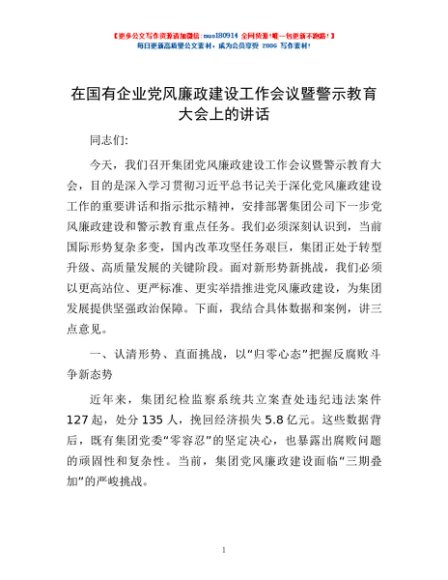 / 在国有企业党风廉政建设工作会议暨警示教育大会上的讲话