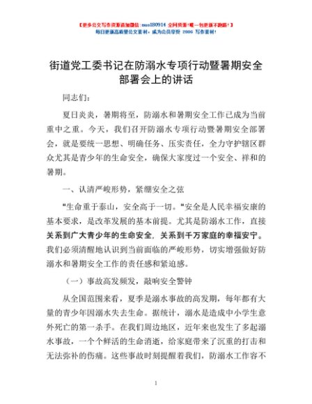 / 街道党工委书记在防溺水专项行动暨暑期安全部署会上的讲话