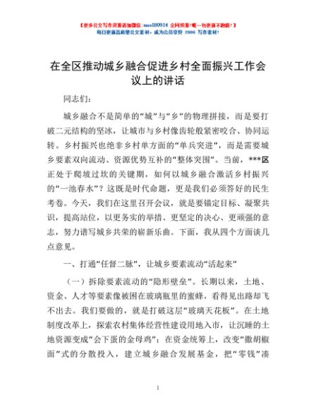 / 在全区推动城乡融合促进乡村全面振兴工作会议上的讲话