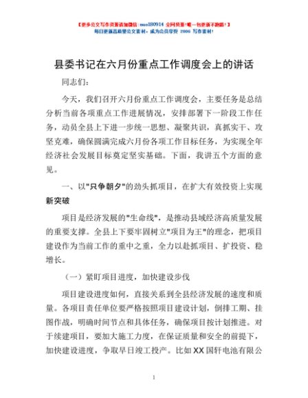 / 县委书记在六月份重点工作调度会上的讲话