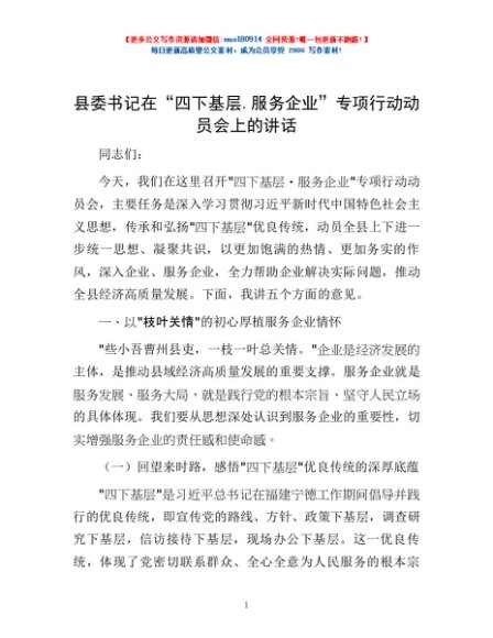 / 县委书记在“四下基层.服务企业”专项行动动员会上的讲话