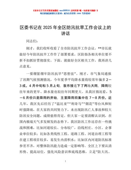 / 区委书记在2025年全区防汛抗旱工作会议上的讲话