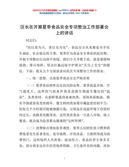 / 区长在开展夏季食品安全专项整治工作部署会上的讲话