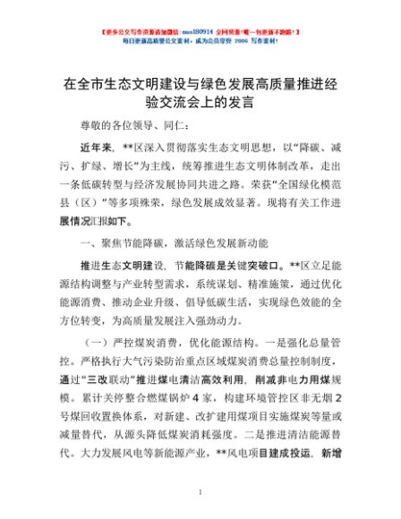 / 在全市生态文明建设与绿色发展高质量推进经验交流会上的发言