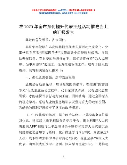 / 在2025年全市深化提升代表主题活动推进会上的汇报发言