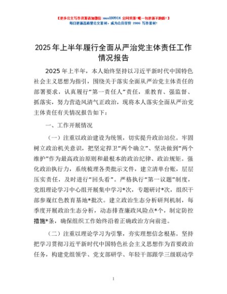 / 2025年上半年履行全面从严治党主体责任工作情况报告