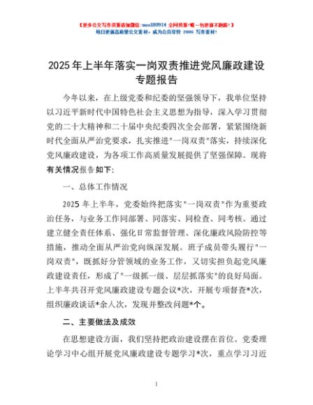 / 2025年上半年落实一岗双责推进党风廉政建设专题报告