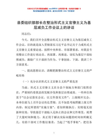 / 县委组织部部长在整治形式主义官僚主义为基层减负工作会议上的讲话
