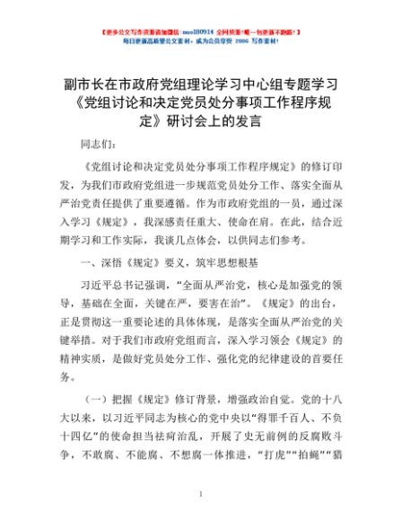 / 副市长在市政府党组理论学习中心组专题学习《党组讨论和决定党员处分事项工作程序规定》研讨会上的发言