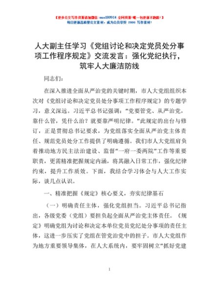/ 人大副主任学习《党组讨论和决定党员处分事项工作程序规定》交流发言:强化党纪执行,筑牢人大廉洁防线