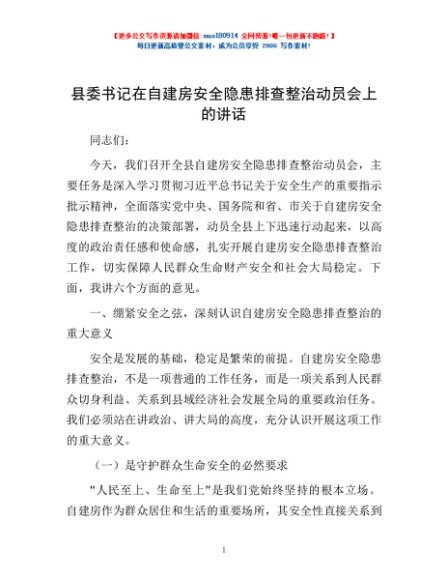 / 县委书记在自建房安全隐患排查整治动员会上的讲话