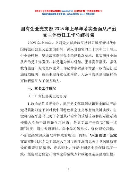 / 国有企业党支部 2025 年上半年落实全面从严治党主体责任工作总结报告