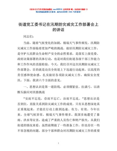 / 街道党工委书记在汛期防灾减灾工作部署会上的讲话