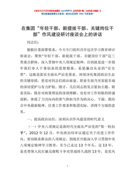 / 在集团“年轻干部、新提拔干部、关键岗位干部”作风建设研讨座谈会上的讲话