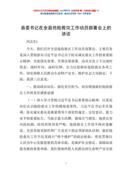 / 县委书记在全县抢险救灾工作动员部署会上的讲话