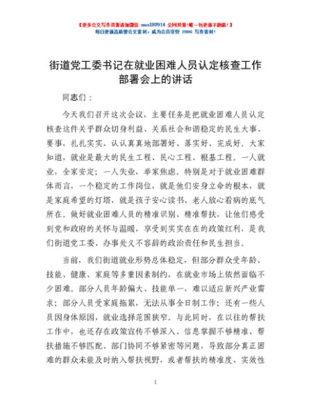 / 街道党工委书记在就业困难人员认定核查工作部署会上的讲话