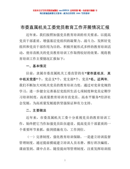 / 市委直属机关工委党员教育工作开展情况汇报