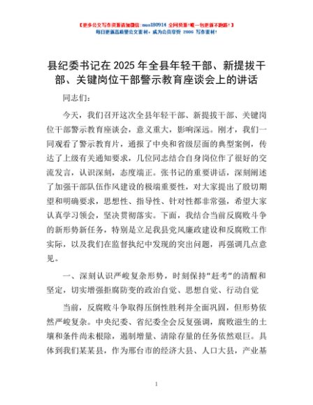 / 县纪委书记在2025年全县年轻干部、新提拔干部、关键岗位干部警示教育座谈会上的讲话