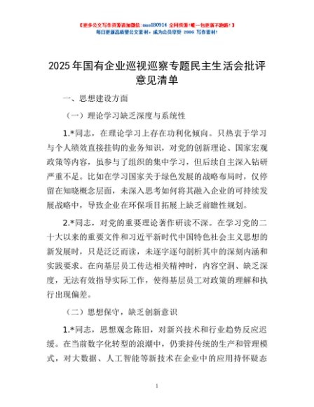 / 2025年国有企业巡视巡察专题民主生活会批评意见清单
