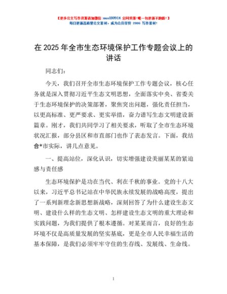 / 在2025年全市生态环境保护工作专题会议上的讲话